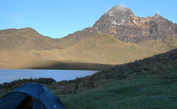 El fraterno saludo de un vaquero transeúnte por el lugar levanta a los expedicionarios y al salir del campamento, en todo su esplendor se observa el volcán Cotopaxi, el mismo que se reflejaba en las aguas de la Laguna Quilindaña, rodeando a éste una tenue bruma típica de un frío amanecer.