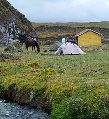 Una vez armadas las cargas, mochilas de guías y turistas, que llevarán los caballos bajo el cuidado de los arrieros, se emprende una extraordinaria aventura de aproximadamente 4 horas que atravesando montañas, pajonales, pantanos y surcando largos y estrechos senderos arriban a la mágica y misteriosa Laguna llamada Quilindaña, en cuyo costado se levanta el primer campa- mento con carpas para pernoctar y cocinar.