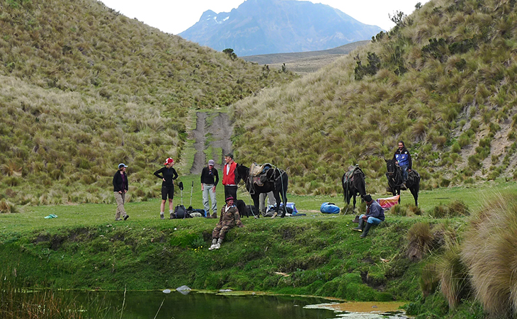 Se comienza a caminar junto a un canal de regadío desde las 9 de la mañana en un clima despejado que auguraba éxitos para subir al día siguiente a la cumbre del volcán activo más alto del mundo, el Cotopaxi. A las 13 horas en punto el grupo se encuentra en la laguna de Limpiopungo, mientras que el chofer de Jeep 4X4 esperaba ya a la delegación para trasladarlo hasta el parqueaderos ubicado a 4.650 metros de altitud. Aquí nos despedimos de los arrieros, quienes a caballo emprenderán su retorno a casa de 7 horas hasta Mulaló, toda vez que llegarán a las ocho de la noche.