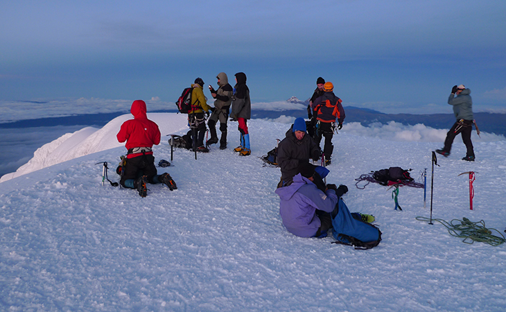 La ruta se encuentra bastante segura, con buena huella y la cordada camina a buen ritmo; en Yanasacha a 4.700 metros empieza a amanecer a las 5 de la madrugada y a las 6 de la mañana cuando el sol emana sus primeros rayos de luz llegamos a la cumbre, abrazos y lágrimas de emoción, es el resultado de haber alcanzado uno de los mayores anhelos. Desde allí se podía observar la mayoría de las altas cumbres ecuatorianas como el Antizana, Cayambe, Ilinizas, Chimborazo Tungurahua y demás montañas; simplemente es una vista espectacular, y todo el esfuerzo y la dedicación para esta ascensión es recompensada.